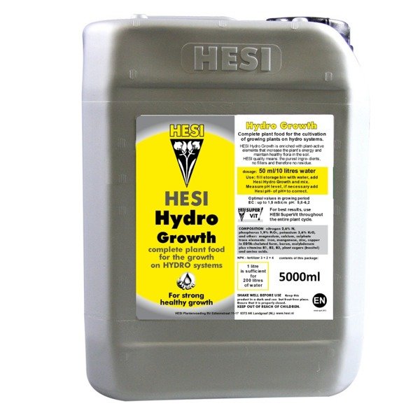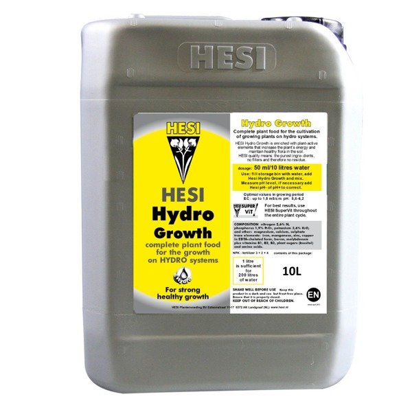HESI Hydro Growth contains proportionally more nitrogen components than HESI Hydro Bloom, because in the growth phase the plant needs more nitrogen for the production of new plant parts. The vital components are fully adapted to the growth phase, given the plant is embedded in a hydro medium such as in cotton wool.