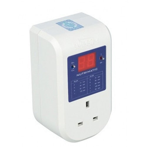 The Nutrimatic is a part pre-programmed pump timer that is perfect for use in drip irrigation systems. It is the first precision seconds timer that adjusts the frequency of the irrigation cycles to match the plants requirements. You set the number of seconds you want each dose to last, and the timer takes care of the frequency of the doses so you don t need to worry about when or how often you should be feeding.